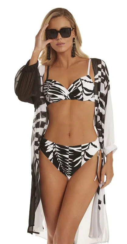 Avasta mugav ja kaunis bikiinikomplekt suuremale rinnale. D-kujulised traadid pakuvad tuge, reguleeritavad paelad tagavad täiusliku istuvuse, kõrge vöökoht ja elegantne mustvalge lehetrükk loovad kauni rannailme.