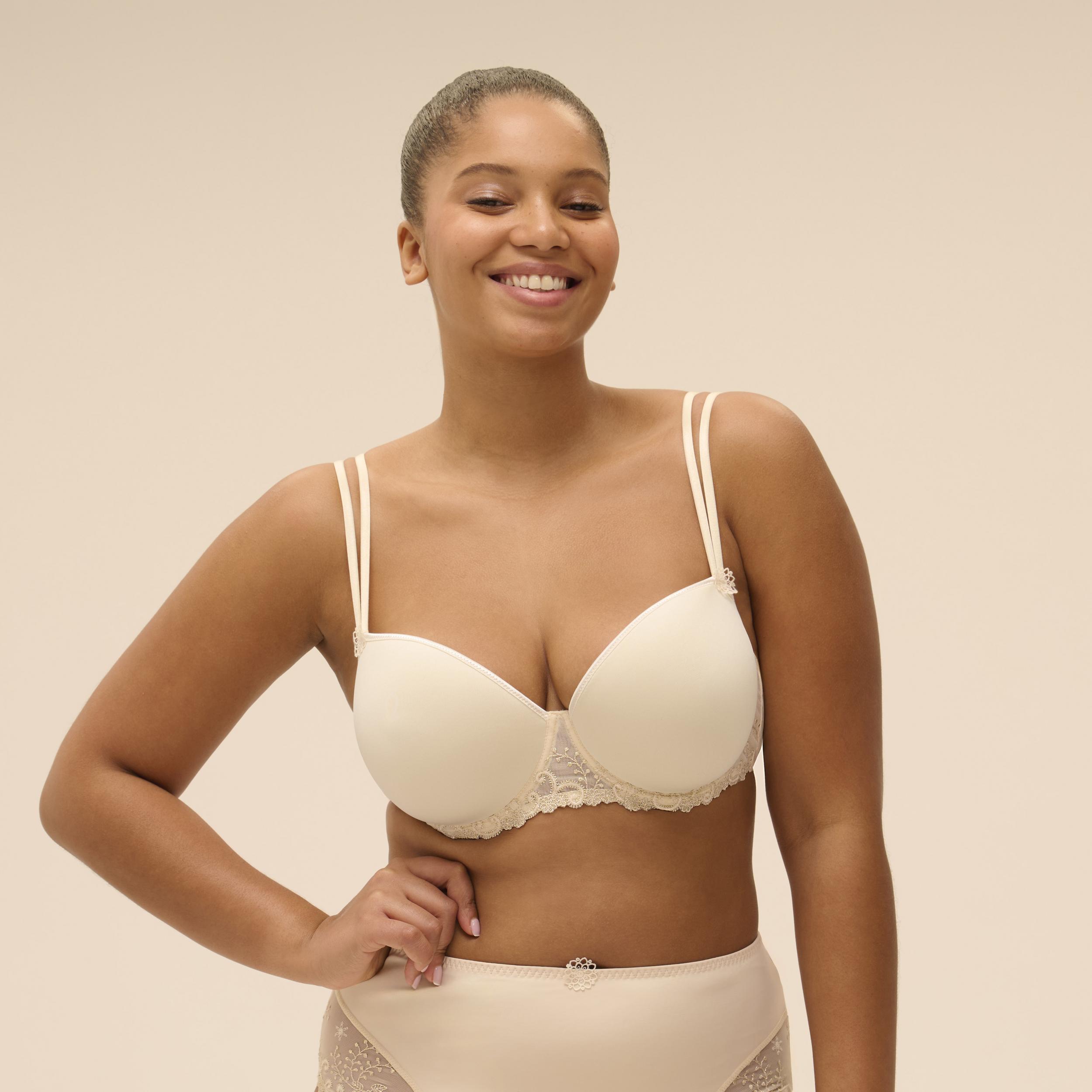 Üks populaarsemaid lõikeid. 3D Spacer revolutsiooniline materjal, pehme tugevdus. Sobib pringidele ja pehmematele rindadele, suurus DG, dekolteele ja liibuvate T-särkide alla. Rinnahoidja ümbermõõt on peene mustriga tikand ja detailid õlapaeltel. Keskosa ja küljed on vooderdatud tahke tülliga. Ümar, kuid loomulik dekoltee kuju ilma volüümi lisamata.