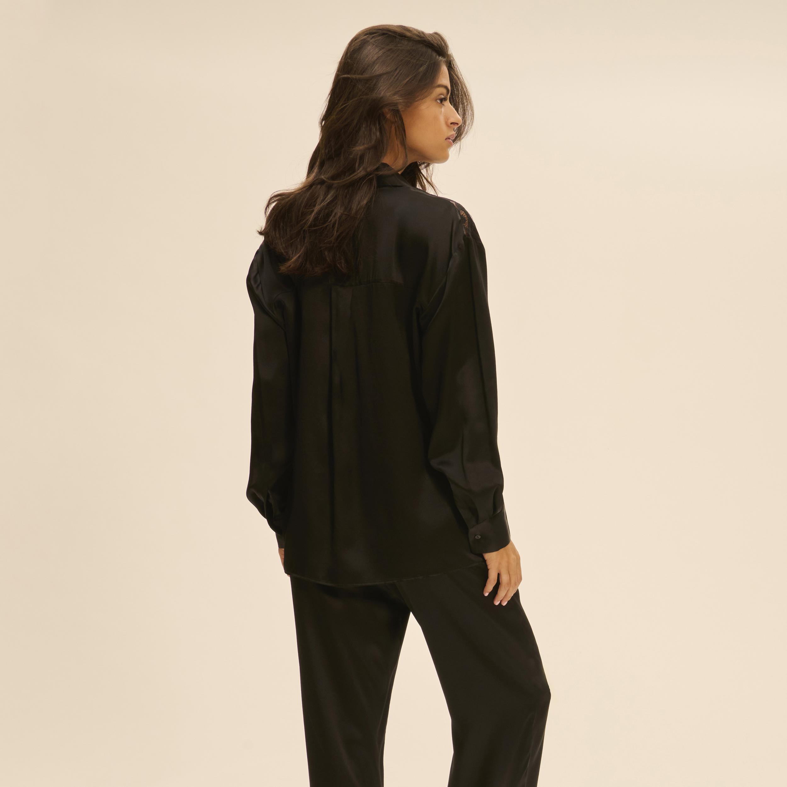 Laiema lõikega siidist särk, mis sobib nii koduseks kandmiseks kui ka pidulikumaks kandmiseks. Õlgadel pitsist väljalõiked. Krael on nööbiga kinnis. Mugava kandmise tagamiseks tagaküljel voldid. Pikkadel varrukatel on alläär ja nööpkinnitus. Nööbid sobivad kangaga toon-toonis.